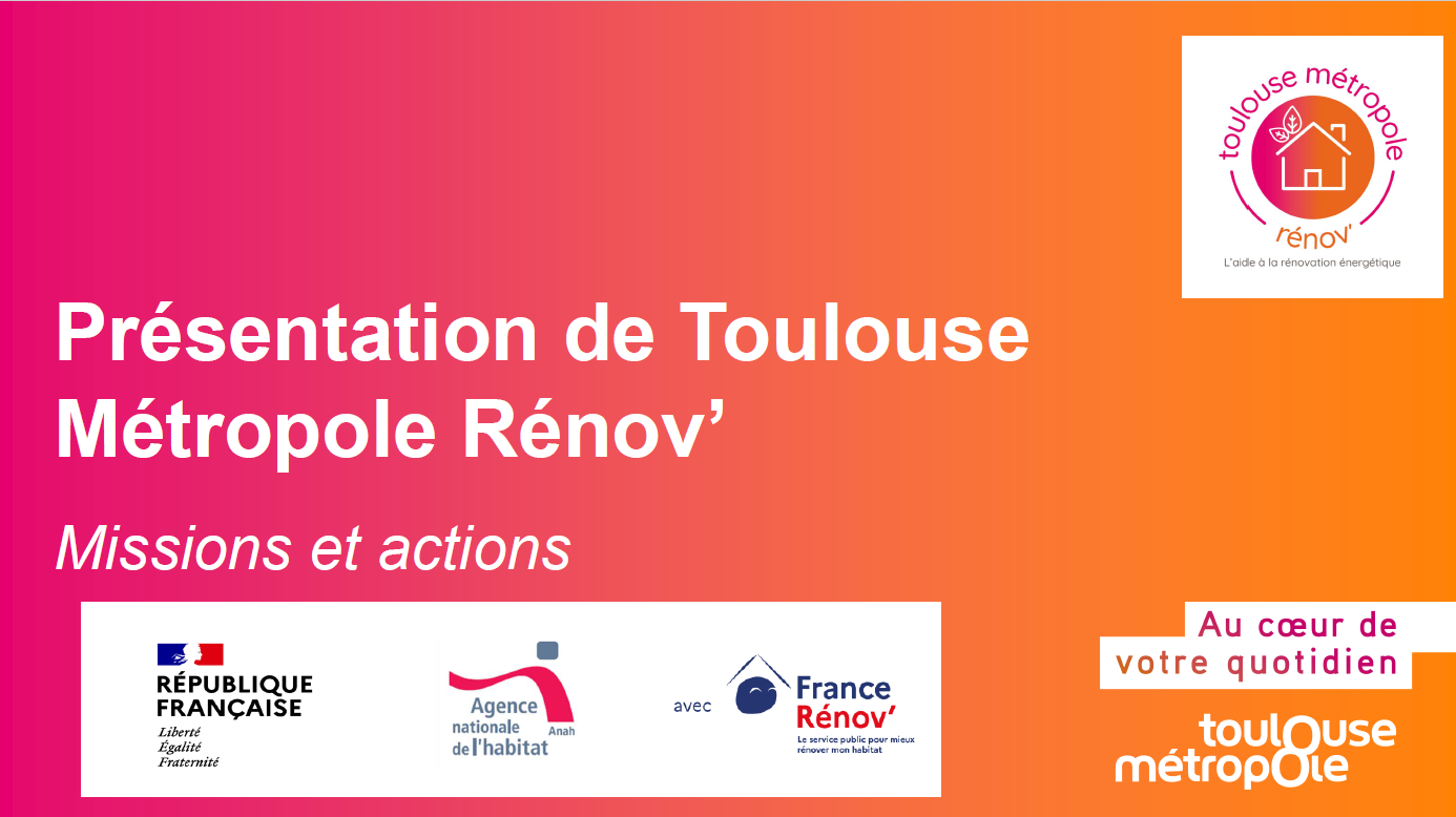 Toulouse Métropole vous informe que les données recueillies font l'objet d'un traitement informatique nécessaire au fonctionnement du service Toulouse Métropole Rénov’ (service d'accompagnement des particuliers dans leur projet de rénovation énergétique de leur logement). Toulouse Métropole est responsable du traitement, représentée par la Toulouse Métropole Rénov’. Seuls sont destinataires des données les services gestionnaires du dispositif.